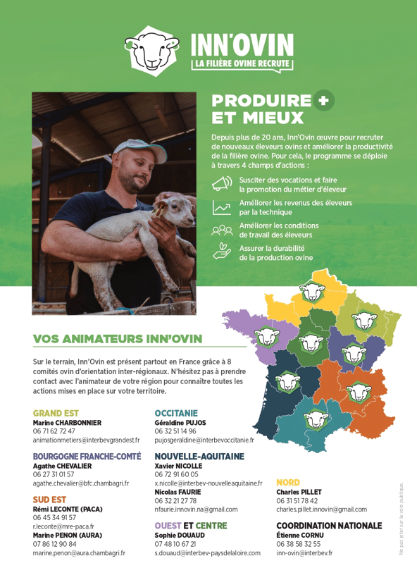 Le programme Reconquête Ovine, initié en 2009, a permis de lancer une dynamique au sein de la production ovine grâce à des actions tournées vers l’amélioration des performances techniques et de l’image de la production. Une évaluation du programme a permis de démontrer l’intérêt de ces actions et l’élan créé par cette dynamique. Mais le manque de moyens et de ressources sur le terrain ont nuancé les résultats. Face à ces constats, et dans l’élan du séminaire « dessine-moi un mouton » organisé en septembre 2014, la filière ovine (lait et viande) a réuni l’ensemble de ses partenaires autour d’un nouveau programme d’actions techniques et de promotion, Inn’Ovin, autour de deux grands enjeux :