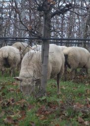 Légende photo : Les brebis désherbent mieux au pied des arbres que les machines